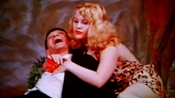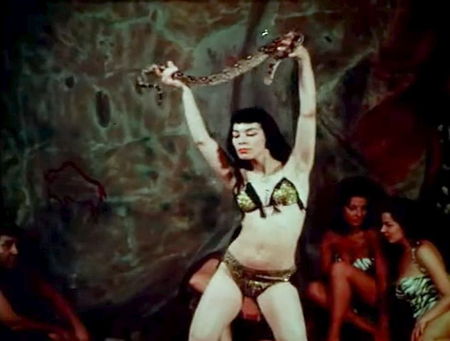 Plot? Oh, yeah. There’s a giant terrorizing the locals, whom Charlie must defeat (the hat mentioned above might be relevant). But it’s mostly more burlesque routines, which do not improve with greater exposure. The best thing the film has to offer is perhaps a dance with a snake, performed by a vaguely Bettie Page-alike. It’s certainly an improvement on Charlie’s comedy. The actual nudity is notable for being almost entirely in cutaways, as if the actresses didn’t want to be in the same room as the star. Don’t blame them there. What stands out otherwise is: so many naked women, and not a single tattoo between them. Truly, it was a different time…