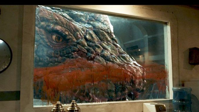 Okay, the IMDb (where the film appears only under its alternate title) gives the following synopsis: “A giant sea serpent and it’s horde of aggressive minions lay siege to a cruise ship leaving a mutated oversized gorilla breaking free from the cargo hold to try and save the day.” I was about to savage the inaccuracy of this, because when I think of a “sea serpent”, I imagine something like a kraken – basically a giant squid. I could perhaps stretch to a plesiosaur, Nessie style. What we have here is neither. It’s an oversized snake. However: it is a serpent, and it is at sea. So, technically, they are not wrong, dammit.