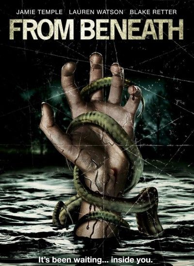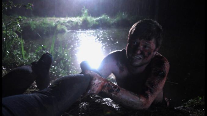 Couple Sam (Watson) and Jason (Temple) are on their way into the countryside to visit Sam’s sister at her house. On arrival, there’s nobody around, so they opt to go for a nice, cooling dip in the lake on the property. BIG mistake, you will probably be unsurprised to hear, especially if you were paying attention to the title. Jason comes out of the water feeling something has attacked his leg, and indeed, entered it. They retreat to the house, bandage the limb in question, and wait for the sister. She’ll be a while, since she is, in fact, lying dead in the basement. There is – colour me shocked – no phone service, and when they eventually try to leave (after about the tenth time Chris had yelled at them to depart), the car won’t start.