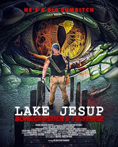 Lake Jesup (and I can’t be the only one who keeps feeling that’s misspelled) is a real spot in Florida, covering 65,000 acres, but with a maximum depth of just ten feet. It is, per Wikipedia, “considered to support one of the state’s densest populations of alligators.” Here, there’s one in particular, the Bonecrusher of the previous (better?) title, who escapes from a park run by shameless huckster Angus Sullivan (Benninghofen). He makes no bones about having encouraged aggressive behaviour in his animals, to increase their commercial appeal. That this has led to Bonecrusher eating people, he merely considers free advertising. Local mayor Sam Neuhauser (King) is less impressed and contracts with veteran hunter Bubba Coggins (Russo) to take care of the man-eating creature.