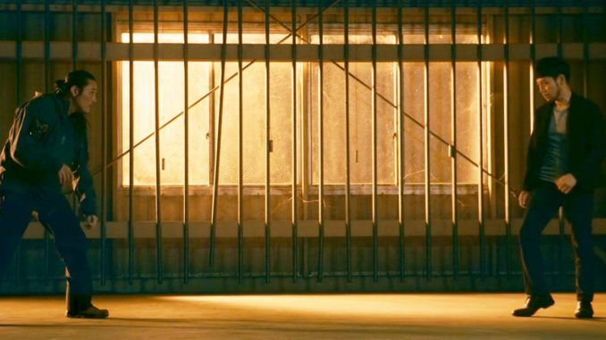 This begins with apparent behind-the-scenes footage of an action film called Birth. In it, creator Takuma Toshiro (Sakaguchi) explains his uncompromising philosophy of martial arts film-making, bemoaning the lack of reality in the genre. He also promotes his own style, called “Assassination-jutsu”. Ten years later, his career has gone nowhere, despite Birth being a cult hit. Toshiro is stuck playing the middle boss in mediocre movies, made by people who do not share his vision, to put it mildly. He has one devoted disciple, Akira (Fukuyama), who helps get a location for a possible shoot of a movie in Toshiro’s style. It’s a disused factory on an island. Except, they find another film crew in place.