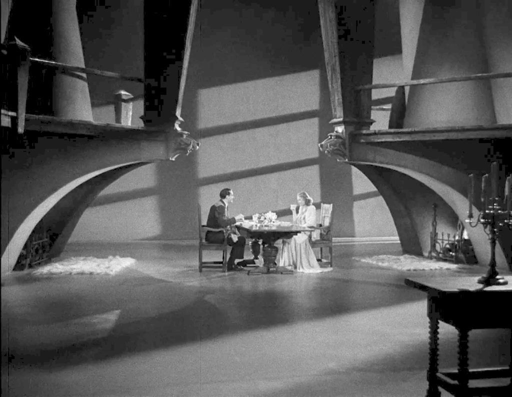 The first thing is how nice Wolf seems. He may not be fully aware of his family’s reputation, but clearly wants to do better. The locals, however, are having none of it, or Wolf’s efforts to paint his father Henry as “the unwilling, unknowing cause of tragedy,” and simply walk off in the middle of his arrival speech. He, his wife Elsa and son Peter, then head up to their ancestral home. And, I must say, it’s got some stunning style, not least a staircase which appears to defy all logic in the route it takes to the upper floors. The whole place seems right out of a German Expressionist playbook, with floor-to-ceiling windows and space at an almost palatial level (below). I don’t know who the old Baron’s architect was, but I’d like to hire him for some projects.