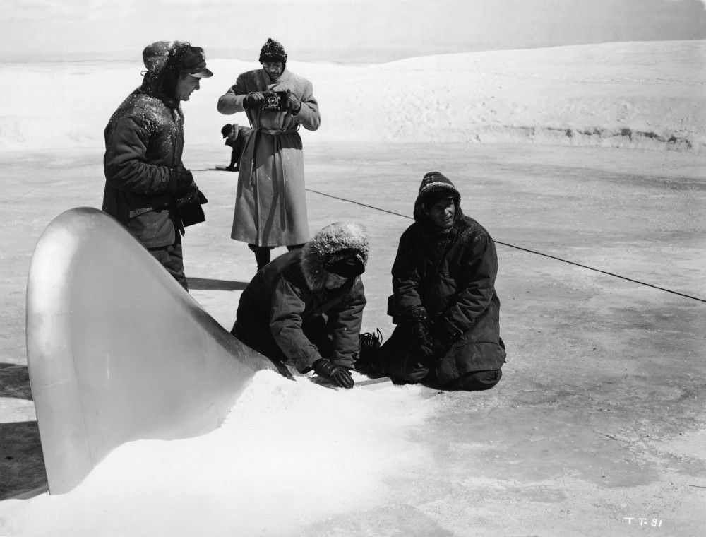 The remake renders the second part of the title irrelevant, because we have already seen the spaceship plummet to Earth. The original takes a more leisurely approach, beginning in Anchorage in front of a roaring fireplace, where some of the main characters are playing poker. These include Captain Pat Hendry (Tobey) and journalist Ned Scott (Spencer), the latter tagging along when Hendry is ordered to fly up and assist a research facility near the North Pole. Its head, Dr. Carrington (Cornthwaite), has requested help after reporting a plane crashing nearby. On the way, Hendry experiences a major magnetic anomaly, and on arrival learns from Carrington it’s the equivalent of twenty thousand tons of iron. Yet it changed course on the way in, something a meteor couldn’t do.