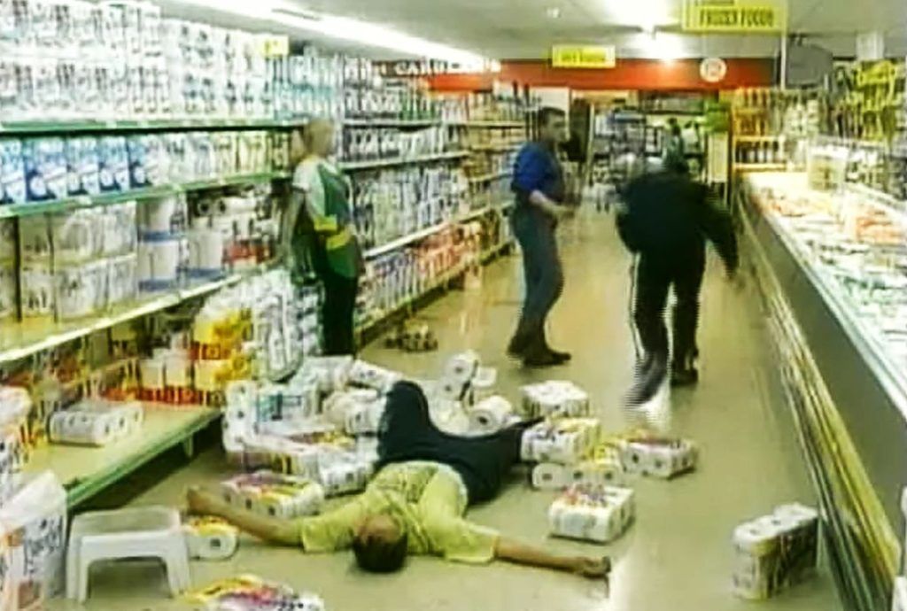 The story is roughly equal parts martial-arts movie cliché, and batshit crazy WTFness. Jimmy Bennett (played by Bennett, you will be astonished to hear) gets out from St. Claude’s Reform School after ten years there, for reasons never explained. Returning to Trim, he wants to discover who was responsible for killing his kung-fu master father. He makes an enemy of Mikey (Graham), the son of Loughlan, who has his eye on local supermarket hottie, Nicola (O’Sullivan). Jimmy rescues her from Mikey’s thugs – including some supermarket-fu (below) – and the couple begin a relationship. It is presumably why we get an extended sequence of them attending a local funfair, because it serves no purpose. It does allow you to wonder how Jimmy lives, since there’s no indication of gainful employment.